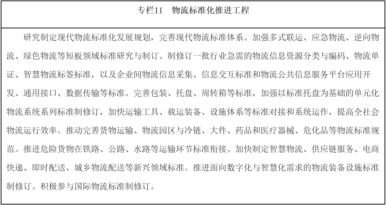 ——現(xiàn)代物流發(fā)展制度環(huán)境更加完善。物流標準規(guī)范體系進一步健全,標準化、集裝化、單元化物流裝載器具和包裝基礎模數(shù)廣泛應用。社會物流統(tǒng)計體系、信用體系更加健全,營商環(huán)境持續(xù)優(yōu)化,行業(yè)協(xié)同治理體系不斷完善、治理能力顯著提升。