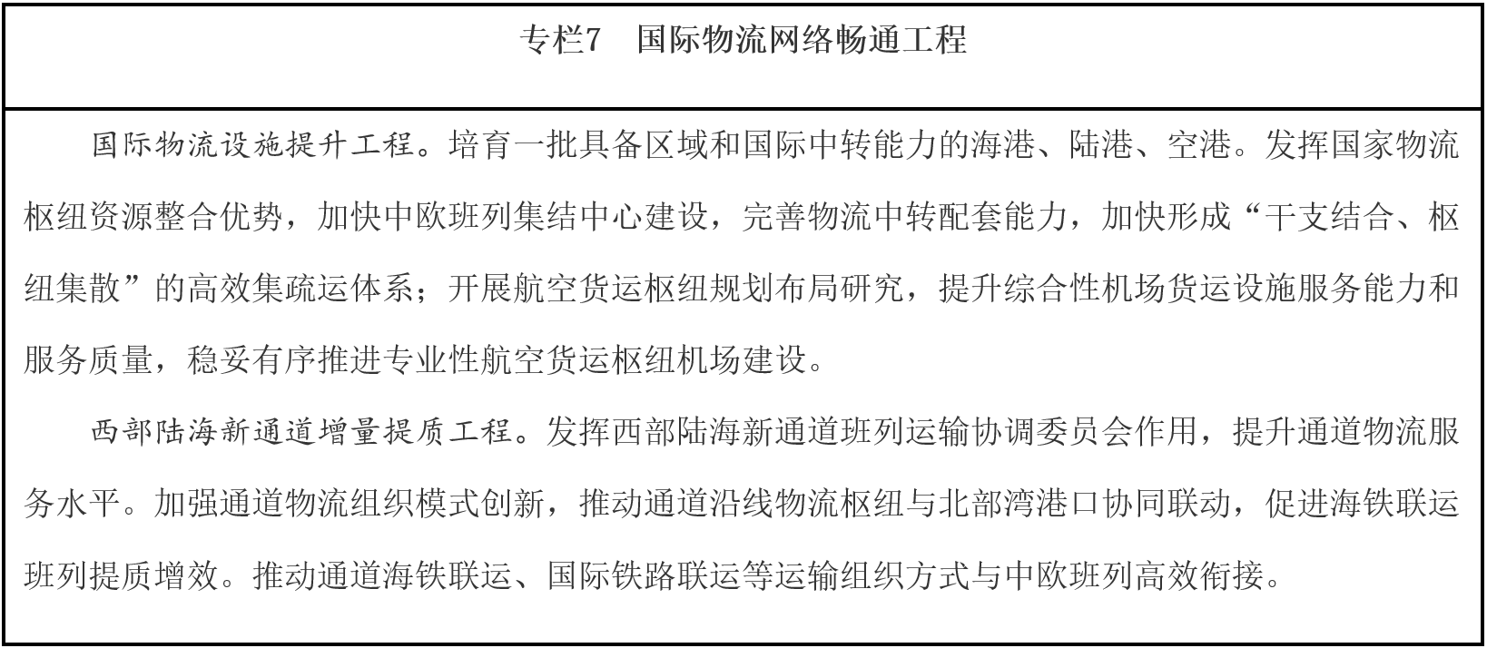 發(fā)展物流通道經濟。圍繞共建“一帶一路”、長江經濟帶發(fā)展等重大戰(zhàn)略實施和西部陸海新通道建設,提升“四橫五縱、兩沿十廊”物流大通道沿線物流基礎設施支撐和服務能力,密切通道經濟聯(lián)系,優(yōu)化通道沿線產業(yè)布局與分工合作體系,提高產業(yè)組織和要素配置能力。