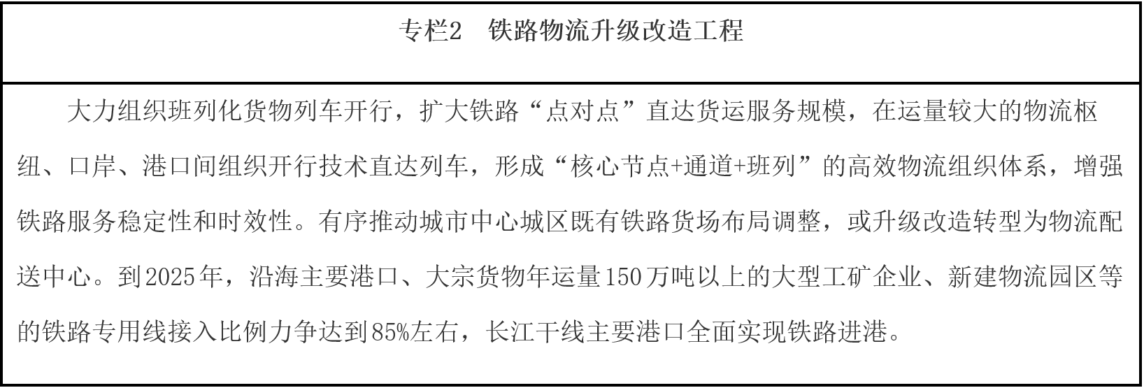 推進結構性降成本。加快推進鐵路專用線進港區(qū)、連園區(qū)、接廠區(qū),合理有序推進大宗商品等中長距離運輸“公轉鐵”、“公轉水”。完善集裝箱公鐵聯(lián)運銜接設施,鼓勵發(fā)展集拼集運、模塊化運輸、“散改集”等組織模式,發(fā)揮鐵路干線運輸成本低和公路網(wǎng)絡靈活優(yōu)勢,培育有競爭力的“門到門”公鐵聯(lián)運服務模式,降低公鐵聯(lián)運全程物流成本。統(tǒng)籌沿海港口綜合利用,提升大型港口基礎設施服務能力,提高碼頭現(xiàn)代化專業(yè)化規(guī)?;剑涌焱七M鐵水聯(lián)運銜接場站改造,提高港口鐵路專用線集疏網(wǎng)絡效能,優(yōu)化作業(yè)流程。完善內河水運網(wǎng)絡,統(tǒng)籌江海直達、江海聯(lián)運發(fā)展,發(fā)揮近海航線、長江水道、珠江水道等水運效能,穩(wěn)步推進貨物運輸“公轉水”。推進鐵水聯(lián)運業(yè)務單證電子化,促進鐵路、港口信息互聯(lián),實現(xiàn)鐵路現(xiàn)車、裝卸車、貨物在途、到達預確報以及港口裝卸、貨物堆存、船舶進出港、船期艙位預定等鐵水聯(lián)運信息交換共享。支持港口、鐵路場站加快完善集疏運油氣管網(wǎng),有效對接石化等產業(yè)布局,提高管道運輸比例。