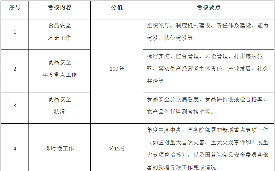 1.具體考核指標(biāo)及分值根據(jù)年度重點(diǎn)工作進(jìn)行調(diào)整,由國(guó)務(wù)院食品安全辦在年度食品安全工作考核方案及其細(xì)則中明確。