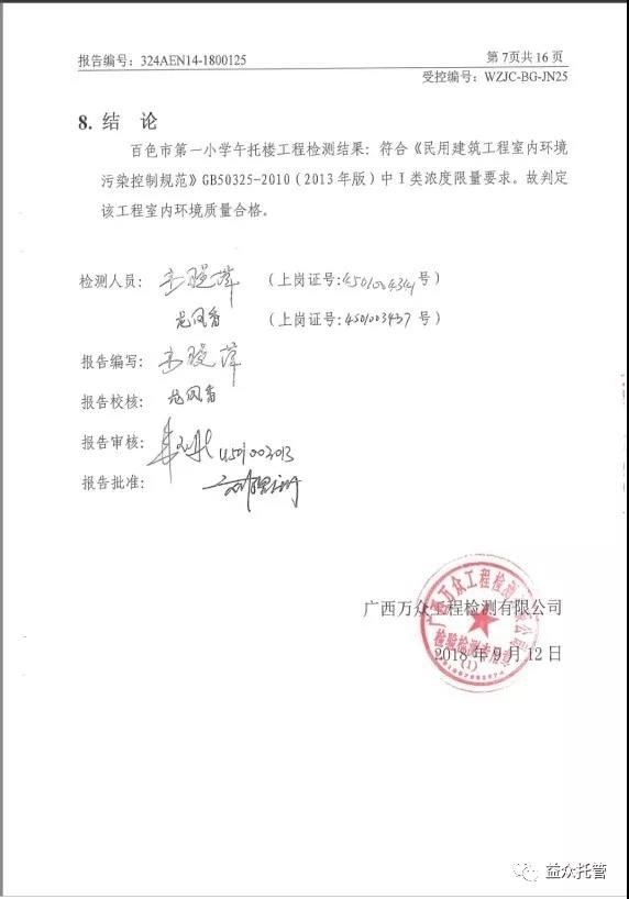 2??018年9月27日,廣西萬眾工程檢測(cè)有限公司提交了檢測(cè)報(bào)告,新托管樓室內(nèi)、室外檢測(cè)點(diǎn)甲醛、氨、苯、TVOC、氡濃度指標(biāo)均符合《民用建筑工程室內(nèi)環(huán)境污染控制規(guī)范》GB50325-2010(2013年版)中I類濃度限量要求,室內(nèi)環(huán)境質(zhì)量合格。