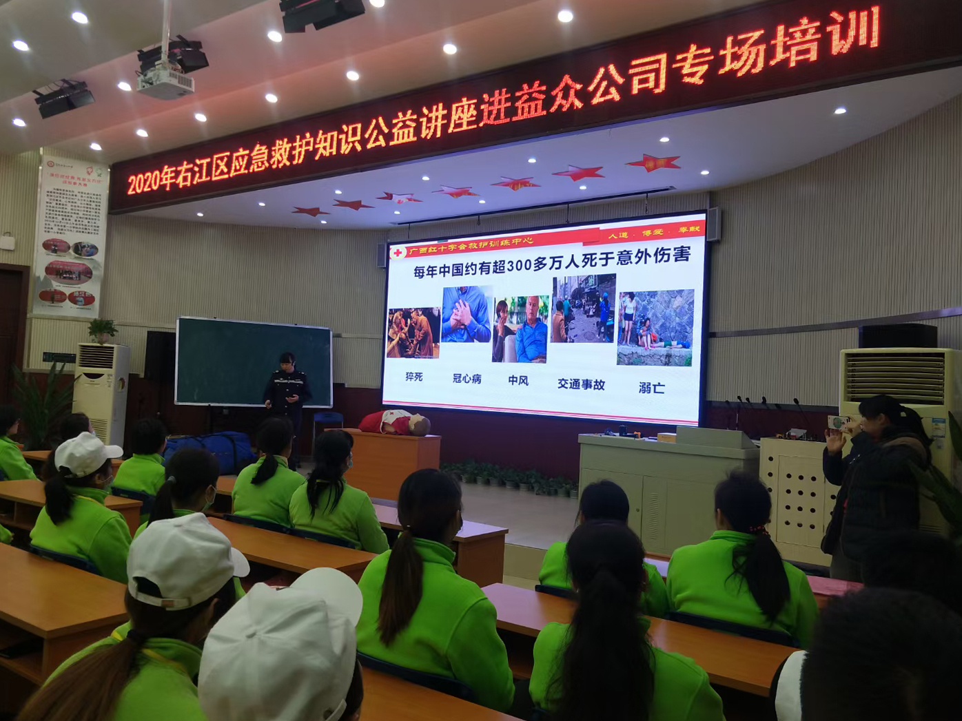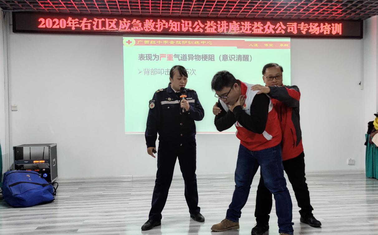 ????????培訓(xùn)由廣西紅十字會(huì)救護(hù)訓(xùn)練中心教務(wù)科長(zhǎng)辛健敏老師主講。在培訓(xùn)中,辛老師介紹了應(yīng)急救護(hù)基本知識(shí)及心肺復(fù)蘇等技能實(shí)踐操作,參訓(xùn)員工們?cè)谂嘤?xùn)人員的指導(dǎo)下認(rèn)真動(dòng)手演練,通過(guò)理論和實(shí)操相結(jié)合方式,掌握基本應(yīng)急救護(hù)知識(shí)技能,并就日常生活中遇到的應(yīng)急救護(hù)步驟進(jìn)行解答。