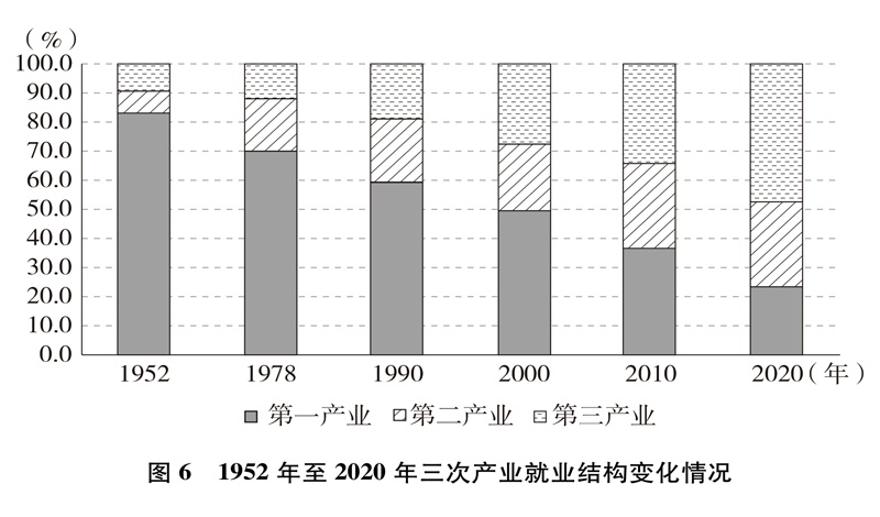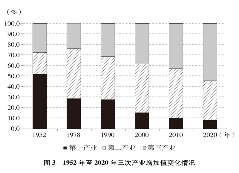 產(chǎn)業(yè)結(jié)構(gòu)優(yōu)化升級。中國已建成世界上最完整的產(chǎn)業(yè)體系,產(chǎn)業(yè)發(fā)展持續(xù)向中高端邁進(jìn)。三次產(chǎn)業(yè)增加值之比從1952年的50.5∶20.8∶28.7到2020年的7.7∶37.8∶54.5,中國從傳統(tǒng)農(nóng)業(yè)大國成為工業(yè)大國、服務(wù)業(yè)大國(圖3),中國經(jīng)濟從依賴單一產(chǎn)業(yè)為主轉(zhuǎn)向依靠三次產(chǎn)業(yè)共同帶動。農(nóng)業(yè)現(xiàn)代化成效顯著,機械化、數(shù)字化、綠色化、功能化、共享化水平明顯提高,廣大農(nóng)民逐步告別“面朝黃土背朝天、一身力氣百身汗”的辛勞,農(nóng)村生產(chǎn)力極大解放;糧食生產(chǎn)能力穩(wěn)步提升,實現(xiàn)谷物基本自給,中國人把飯碗牢牢端在自己手中。中國建成門類齊全、獨立完整的現(xiàn)代工業(yè)體系,工業(yè)化和信息化融合發(fā)展的廣度和深度不斷拓展,“中國制造”向“中國智造”轉(zhuǎn)型升級,產(chǎn)業(yè)鏈供應(yīng)鏈現(xiàn)代化水平進(jìn)一步提升。以新一代信息技術(shù)、生物技術(shù)、高端裝備、綠色環(huán)保為代表的戰(zhàn)略性新興產(chǎn)業(yè)發(fā)展迅速,成為引領(lǐng)高質(zhì)量發(fā)展的重要引擎。數(shù)字經(jīng)濟激發(fā)經(jīng)濟發(fā)展新活力,產(chǎn)業(yè)數(shù)字化和數(shù)字產(chǎn)業(yè)化趨勢加快。現(xiàn)代服務(wù)業(yè)加速發(fā)展,以“互聯(lián)網(wǎng)+”為標(biāo)志的新業(yè)態(tài)、新模式層出不窮,平臺經(jīng)濟、共享經(jīng)濟蓬勃興起,生產(chǎn)性服務(wù)業(yè)向?qū)I(yè)化和高端化發(fā)展,生活性服務(wù)業(yè)向精細(xì)化和高品質(zhì)轉(zhuǎn)變。產(chǎn)業(yè)結(jié)構(gòu)的優(yōu)化升級促進(jìn)了經(jīng)濟更加均衡、更加充分的發(fā)展,人們個性化品質(zhì)化多樣化需求不斷得到滿足。