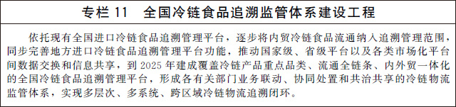 加快建設(shè)全國性冷鏈物流追溯監(jiān)管平臺,完善全鏈條監(jiān)管機制,針對冷鏈物流環(huán)境、主要作業(yè)環(huán)節(jié)、設(shè)施設(shè)備管理等重點,規(guī)范實時監(jiān)測、及時處置、評估反饋等監(jiān)管過程,逐步分類實現(xiàn)全程可視可控、可溯源、可追查。創(chuàng)新監(jiān)管手段,加大現(xiàn)代信息技術(shù)和設(shè)施設(shè)備應(yīng)用力度,強化現(xiàn)場和非現(xiàn)場監(jiān)管方式有機結(jié)合。借鑒新冠肺炎疫情防控期間進(jìn)口冷鏈?zhǔn)称窓z驗檢測檢疫經(jīng)驗做法,優(yōu)化完善工作機制,建立科學(xué)、可靠、高效的冷鏈物流檢驗檢測檢疫體系。