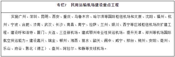 擴(kuò)大航空網(wǎng)絡(luò)覆蓋。推動(dòng)區(qū)域機(jī)場群協(xié)同發(fā)展,建設(shè)京津冀、長三角、粵港澳大灣區(qū)、成渝等世界級機(jī)場群。適時(shí)啟動(dòng)能力緊張樞紐機(jī)場改擴(kuò)建工程,強(qiáng)化樞紐機(jī)場綜合保障能力。合理加密機(jī)場布局,穩(wěn)步建設(shè)支線機(jī)場和專業(yè)性貨運(yùn)樞紐機(jī)場,提升綜合性機(jī)場貨運(yùn)能力和利用率。有序推進(jìn)通用機(jī)場規(guī)劃建設(shè),構(gòu)建區(qū)域短途運(yùn)輸網(wǎng)絡(luò),探索通用航空與低空旅游、應(yīng)急救援、醫(yī)療救護(hù)、警務(wù)航空等融合發(fā)展。優(yōu)化航路航線網(wǎng)絡(luò),加強(qiáng)軍民航空管基礎(chǔ)設(shè)施建設(shè),推廣應(yīng)用空管新技術(shù)。