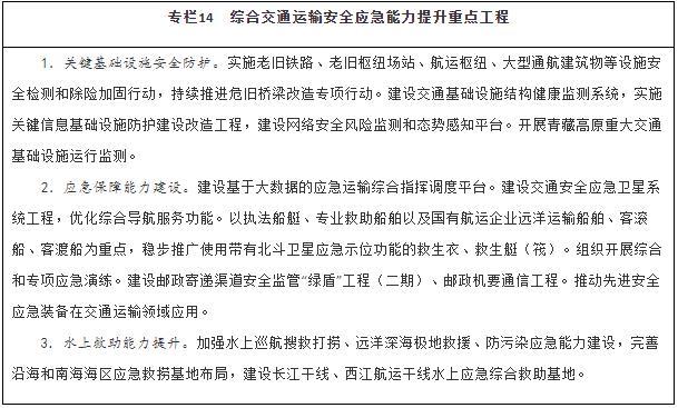 健全綜合交通運(yùn)輸應(yīng)急管理體制機(jī)制,完善應(yīng)急協(xié)調(diào)機(jī)制和應(yīng)急預(yù)案體系,加強(qiáng)交通運(yùn)輸調(diào)度與應(yīng)急指揮平臺(tái)建設(shè)。推進(jìn)區(qū)域性公路應(yīng)急裝備物資儲(chǔ)備中心建設(shè)。加強(qiáng)水上交通安全監(jiān)管、航海保障和救助打撈能力建設(shè),完善沿海和內(nèi)河溢油應(yīng)急設(shè)備庫,構(gòu)建陸??仗煲惑w化水上交通運(yùn)輸安全保障體系。建設(shè)城市軌道交通應(yīng)急演練中心。以骨干航空物流企業(yè)為主體構(gòu)建航空應(yīng)急服務(wù)網(wǎng)絡(luò)。建設(shè)海事監(jiān)管指揮系統(tǒng)。在開展城市交通基礎(chǔ)設(shè)施地下空間、低洼區(qū)域、重點(diǎn)區(qū)段、重要點(diǎn)位、關(guān)鍵設(shè)施等隱患排查基礎(chǔ)上,建立健全風(fēng)險(xiǎn)臺(tái)賬和災(zāi)害隱患清單,補(bǔ)齊設(shè)施設(shè)備、應(yīng)急搶險(xiǎn)物資等短板,持續(xù)完善應(yīng)急處置預(yù)案,健全應(yīng)急響應(yīng)機(jī)制,提升應(yīng)對極端天氣能力。加強(qiáng)應(yīng)急專業(yè)隊(duì)伍和志愿者隊(duì)伍建設(shè),充實(shí)國家應(yīng)急運(yùn)輸儲(chǔ)備力量。健全應(yīng)對重大疫情、防范應(yīng)對恐怖襲擊、保障信息安全等非傳統(tǒng)安全應(yīng)急指揮體系和應(yīng)急交通組織。
