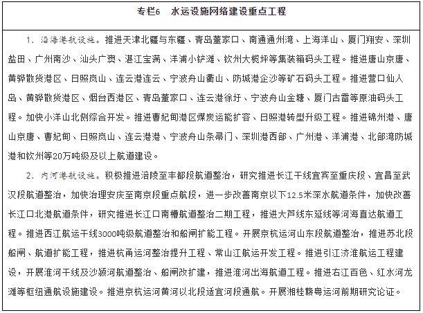 優(yōu)化暢通水運(yùn)設(shè)施網(wǎng)絡(luò)。建設(shè)京津冀、長三角、粵港澳大灣區(qū)世界級港口群,支持山東打造世界一流的海洋港口,推進(jìn)東北地區(qū)沿海港口一體化發(fā)展,優(yōu)化港口功能布局,推動(dòng)資源整合和共享共用。有序推進(jìn)沿海港口專業(yè)化碼頭及進(jìn)出港航道等公共設(shè)施建設(shè)。適度超前建設(shè)糧食、能源、礦產(chǎn)資源的接卸、儲(chǔ)存、中轉(zhuǎn)設(shè)施,推進(jìn)沿海沿江液化天然氣碼頭規(guī)劃建設(shè)。提升內(nèi)河港口專業(yè)化、規(guī)?;?,合理集中布局集裝箱、煤炭、鐵礦石、商品汽車等專業(yè)化碼頭。加強(qiáng)內(nèi)河高等級航道擴(kuò)能升級與暢通攻堅(jiān)建設(shè),完善長江、珠江、京杭運(yùn)河和淮河等水系內(nèi)河高等級航道網(wǎng)絡(luò),進(jìn)一步提升珠三角高等級航道網(wǎng)出海能力,全面加強(qiáng)長三角、珠江—西江高等級航道網(wǎng)未達(dá)標(biāo)段建設(shè)。推動(dòng)重要支流航道和庫湖區(qū)航道、內(nèi)河旅游航道、便民碼頭建設(shè)。