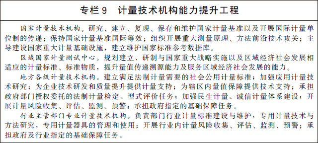 (二十一)加快計(jì)量技術(shù)機(jī)構(gòu)建設(shè)。深化計(jì)量技術(shù)機(jī)構(gòu)改革創(chuàng)新發(fā)展,優(yōu)化整合國(guó)家計(jì)量技術(shù)機(jī)構(gòu)、區(qū)域國(guó)家計(jì)量測(cè)試中心、地方各級(jí)計(jì)量技術(shù)機(jī)構(gòu)和行業(yè)主管部門專業(yè)計(jì)量技術(shù)機(jī)構(gòu)。大力推動(dòng)國(guó)家計(jì)量技術(shù)機(jī)構(gòu)創(chuàng)新發(fā)展,通過(guò)組織開展重大測(cè)量原理、方法前沿技術(shù)攻關(guān),建立量子計(jì)量基準(zhǔn)并保持國(guó)際等效,提供一流的量值溯源和測(cè)量服務(wù),支撐國(guó)家科技創(chuàng)新、工業(yè)競(jìng)爭(zhēng)力提升和經(jīng)濟(jì)社會(huì)發(fā)展。充分發(fā)揮省級(jí)人民政府和行業(yè)主管部門計(jì)量基礎(chǔ)設(shè)施規(guī)劃建設(shè)自主權(quán),加強(qiáng)普惠性、基礎(chǔ)性和公益性計(jì)量基礎(chǔ)設(shè)施建設(shè)。提升計(jì)量技術(shù)機(jī)構(gòu)服務(wù)市場(chǎng)的能力和水平,推動(dòng)形成一批專業(yè)領(lǐng)域服務(wù)平臺(tái),培育一批專業(yè)化、社會(huì)化、網(wǎng)絡(luò)化的服務(wù)機(jī)構(gòu),為經(jīng)濟(jì)社會(huì)發(fā)展和行業(yè)創(chuàng)新提供計(jì)量測(cè)試服務(wù)。