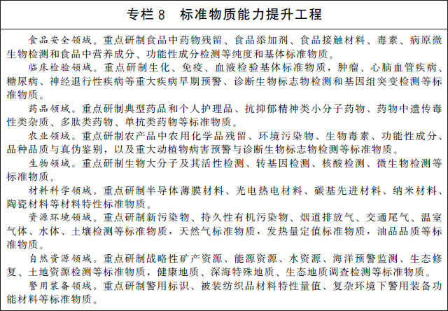 (二十)加大標(biāo)準(zhǔn)物質(zhì)研制應(yīng)用。建立完善以國(guó)家基準(zhǔn)物質(zhì)、國(guó)家標(biāo)準(zhǔn)物質(zhì)和工作標(biāo)準(zhǔn)物質(zhì)為主要組成部分的標(biāo)準(zhǔn)物質(zhì)體系。實(shí)施標(biāo)準(zhǔn)物質(zhì)能力提升工程,加快生命科學(xué)、生物醫(yī)藥、環(huán)境監(jiān)測(cè)、食品安全、自然資源、刑事司法等重點(diǎn)領(lǐng)域的標(biāo)準(zhǔn)物質(zhì)研制和應(yīng)用。加強(qiáng)標(biāo)準(zhǔn)物質(zhì)監(jiān)管能力建設(shè)和關(guān)鍵共性技術(shù)研究,提升標(biāo)準(zhǔn)物質(zhì)不確定度水平。探索建立標(biāo)準(zhǔn)物質(zhì)質(zhì)量追溯制度,建設(shè)一批標(biāo)準(zhǔn)物質(zhì)量值核查驗(yàn)證實(shí)驗(yàn)室,建立標(biāo)準(zhǔn)物質(zhì)質(zhì)量追溯平臺(tái),形成研發(fā)、生產(chǎn)、應(yīng)用全壽命周期的監(jiān)管能力。