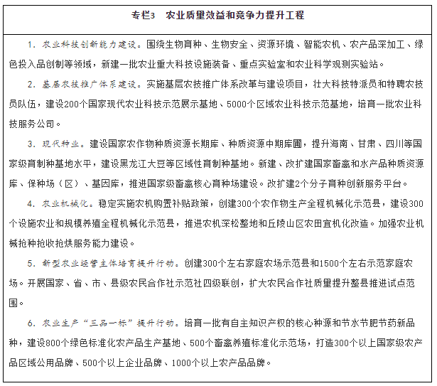 推進(jìn)重點(diǎn)區(qū)域農(nóng)業(yè)發(fā)展。深入推進(jìn)京津冀現(xiàn)代農(nóng)業(yè)協(xié)同發(fā)展,支持雄安新區(qū)建設(shè)綠色生態(tài)農(nóng)業(yè)。深化粵港澳大灣區(qū)農(nóng)業(yè)合作,建設(shè)與國際一流灣區(qū)和世界級(jí)城市群相配套的綠色農(nóng)產(chǎn)品生產(chǎn)供應(yīng)基地。推進(jìn)長江三角洲區(qū)域農(nóng)業(yè)一體化發(fā)展,先行開展農(nóng)產(chǎn)品冷鏈物流、環(huán)境聯(lián)防聯(lián)治等統(tǒng)一標(biāo)準(zhǔn)試點(diǎn),發(fā)展特色鄉(xiāng)村經(jīng)濟(jì)。發(fā)揮海南自由貿(mào)易港優(yōu)勢(shì),擴(kuò)大農(nóng)業(yè)對(duì)外開放,建設(shè)全球熱帶農(nóng)業(yè)中心和動(dòng)植物種質(zhì)資源引進(jìn)中轉(zhuǎn)基地。全域推進(jìn)成渝地區(qū)雙城經(jīng)濟(jì)圈城鄉(xiāng)統(tǒng)籌發(fā)展,建設(shè)現(xiàn)代高效特色農(nóng)業(yè)帶。
