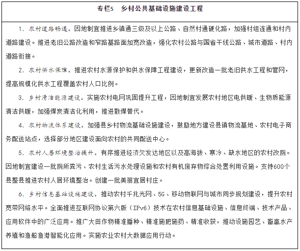 加強(qiáng)鄉(xiāng)村信息基礎(chǔ)設(shè)施建設(shè)。實(shí)施數(shù)字鄉(xiāng)村建設(shè)工程。加快農(nóng)村光纖寬帶、移動(dòng)互聯(lián)網(wǎng)、數(shù)字電視網(wǎng)和下一代互聯(lián)網(wǎng)發(fā)展,支持農(nóng)村及偏遠(yuǎn)地區(qū)信息通信基礎(chǔ)設(shè)施建設(shè)。加快推動(dòng)遙感衛(wèi)星數(shù)據(jù)在農(nóng)業(yè)農(nóng)村領(lǐng)域中的應(yīng)用。推動(dòng)農(nóng)業(yè)生產(chǎn)加工和農(nóng)村地區(qū)水利、公路、電力、物流、環(huán)保等基礎(chǔ)設(shè)施數(shù)字化、智能化升級(jí)。開發(fā)適應(yīng)“三農(nóng)”特點(diǎn)的信息終端、技術(shù)產(chǎn)品、移動(dòng)互聯(lián)網(wǎng)應(yīng)用軟件,構(gòu)建面向農(nóng)業(yè)農(nóng)村的綜合信息服務(wù)體系。