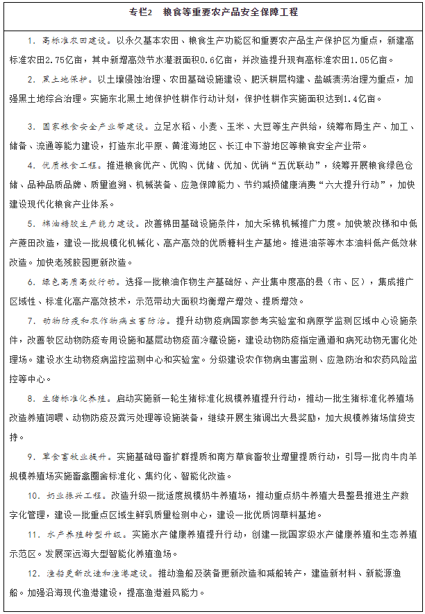 ——糧食等重要農(nóng)產(chǎn)品供給有效保障。糧食綜合生產(chǎn)能力穩(wěn)步提升,產(chǎn)量保持在1.3萬億斤以上,確保谷物基本自給、口糧絕對(duì)安全。生豬產(chǎn)能鞏固提升,棉花、油料、糖料和水產(chǎn)品穩(wěn)定發(fā)展,其他重要農(nóng)產(chǎn)品保持合理自給水平。